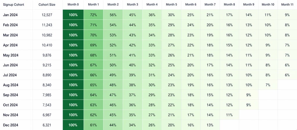 Total revenue can hide a retention problem. If you're constantly winning new customers but losing existing ones at the same rate, your business is essentially running on a treadmill. Cohort analysis shows you whether customers are actually sticking around, and for how long.